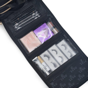 - Main front compartment (flap side) opens up to 3 zippered sections perfect for lashes, pencils and beauty tools